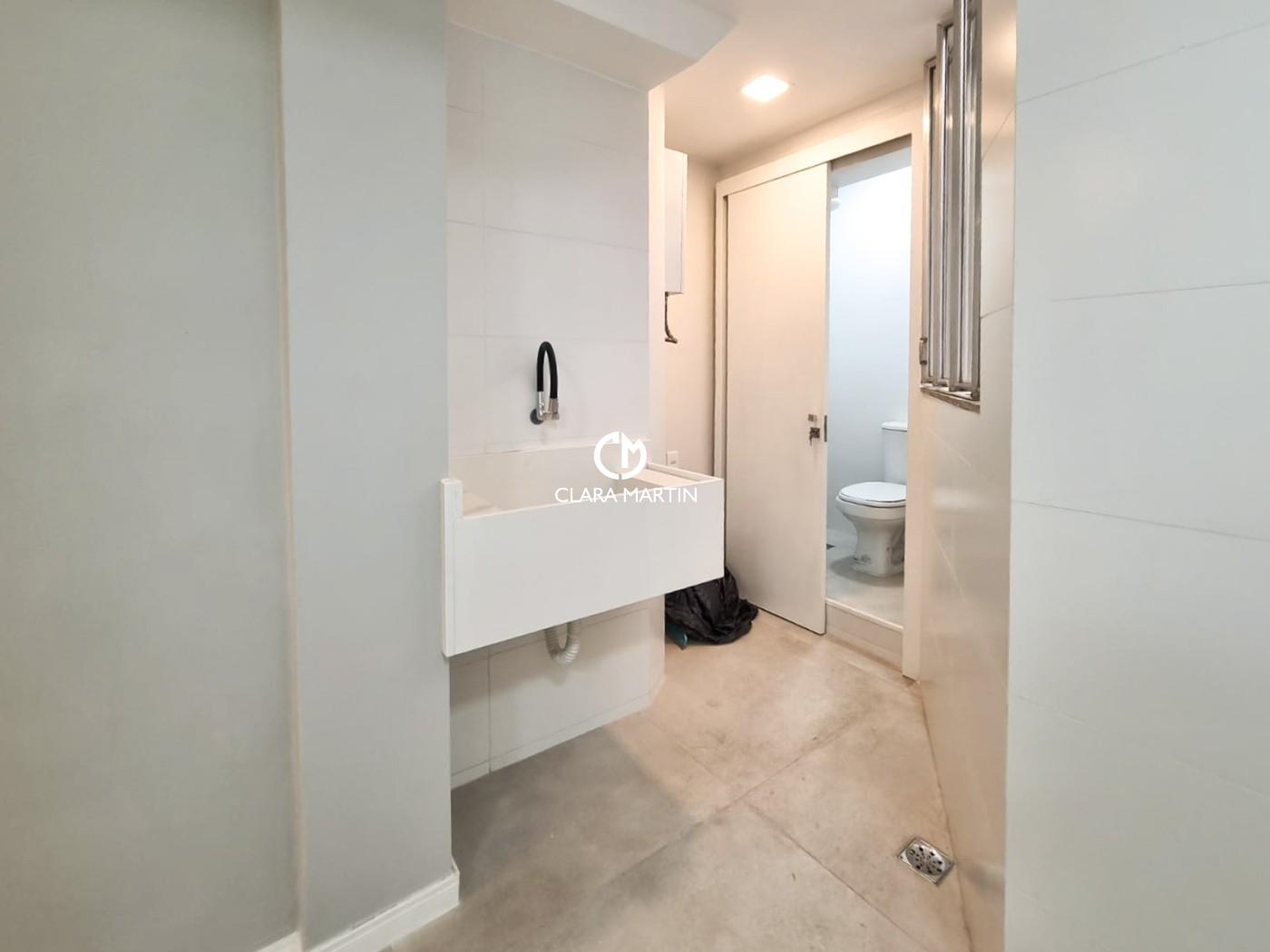 Apartamento reformado no Leblon, 90m² com 3 quartos (2 suítes), sala com vista para árvores, banheiro social, cozinha com mármore travertino, área e banheiro de serviço. Localização privilegiada em rua tranquila, perto de comércio, metrô e praia. 1 vaga de garagem em prédio tradicional com portaria de 6h ás 23hs.
