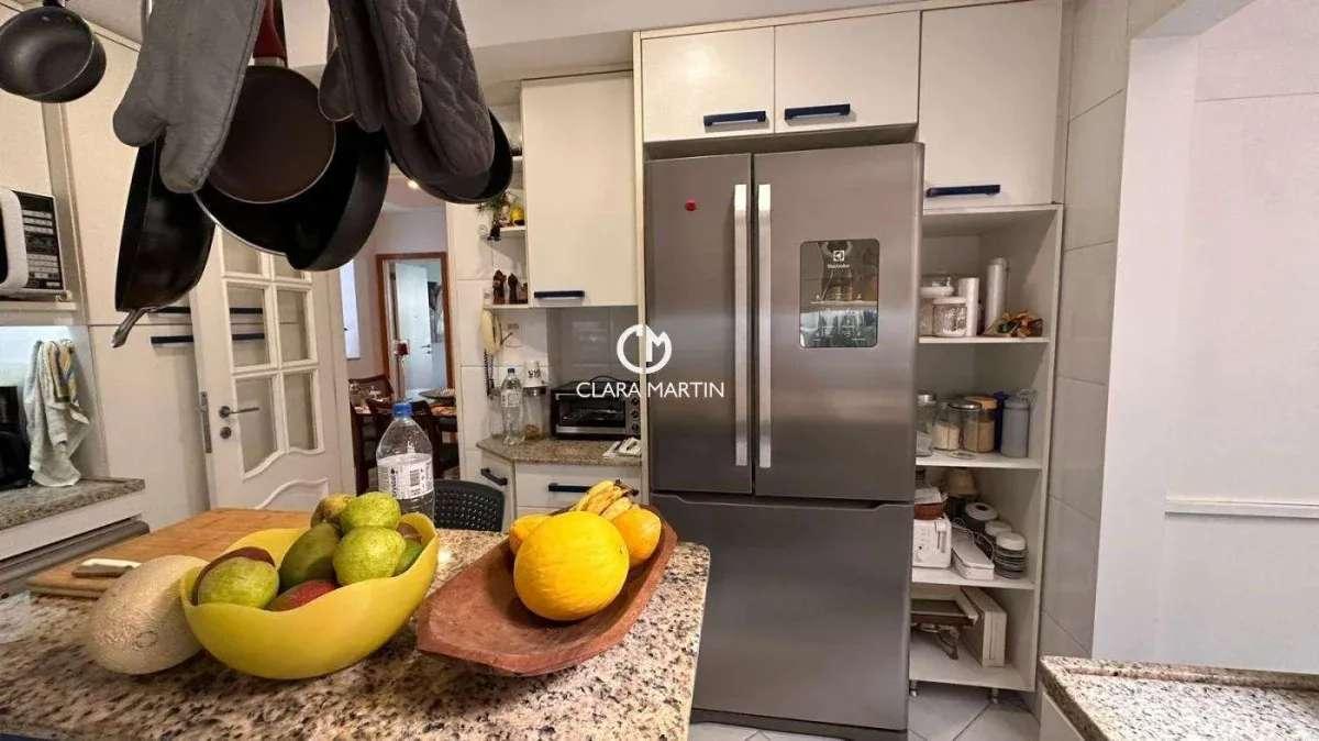 Apartamento amplo com 4 dormitórios (sendo 1 suíte), 4 banheiros e 3 vagas de garagem. Área privativa de 240 m², incluindo varanda, lavabo, cozinha planejada com despensa, área de serviço e WC de empregada. Oferece vista livre, está localizado em rua sem saída e conta com portaria 24h.