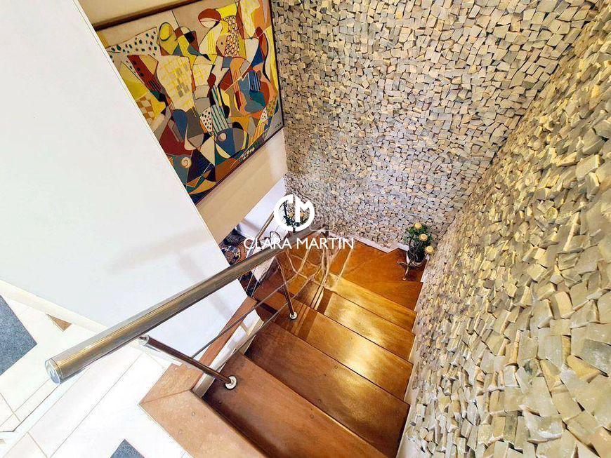 Segundo piso com acesso a uma escada linear, 04 quartos, sendo 01 suíte master com closet, lavabo, circulação com armários, área externa com jacuzzi, churrasqueira e banheiro social, 4 vagas de garagem e portaria 24 horas.